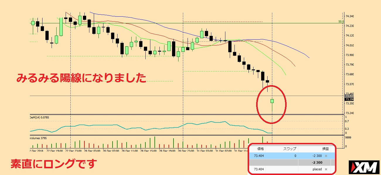 下に長いヒゲができるほど、上昇の力があると考えて短期のロングにしましょう。
