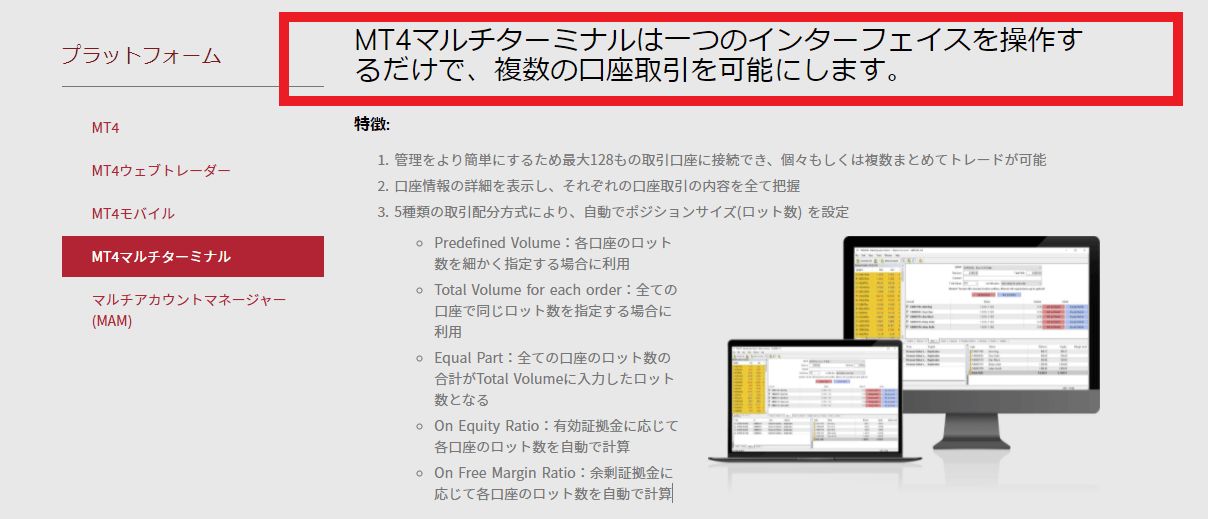 また、「マルチアカウントマネージャー」(MAM)でマスター口座を開設すると、必要な情報をすべてひとつのポータルに集約し、他に開設したすべての口座管理や複数のEAを稼働し運用していくことも楽にできますので、バランスの取れた取り引きをしやすくなっています。