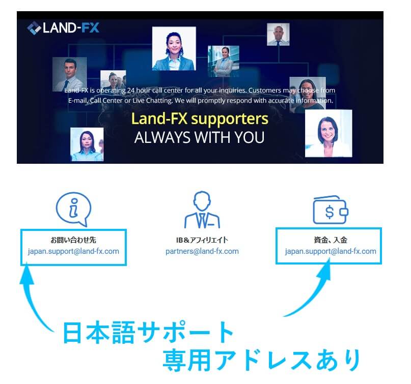 ランドFX(Land FX)のカスタマーサポートは24時間体制。電話、メール、チャットを平日なら深夜でも受け付けています。また、日本人スタッフによる日本語での対応も可能。メールは24時間。電話は平日の10時から18時まで、となっています。ライブチャットに関しては英語オンリーなので注意しましょう。
