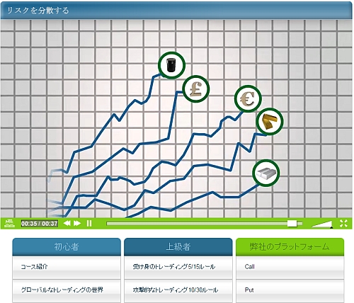 ビデオチュートリアルや取引用語の解説などのコンテンツが充実している業者なので、全くの初心者でも少しずつ勉強しながらバイナリーオプションに取り組めるのが特徴です。